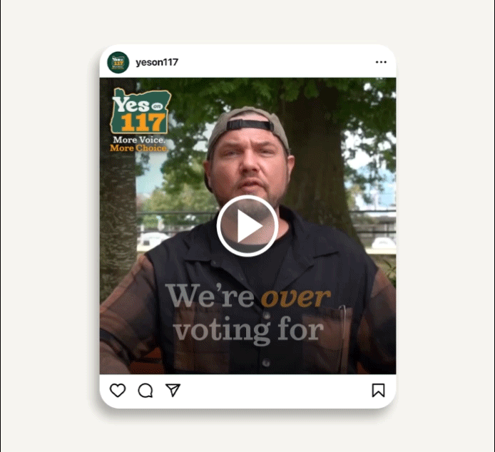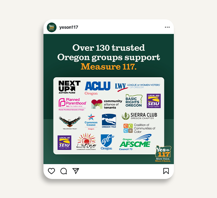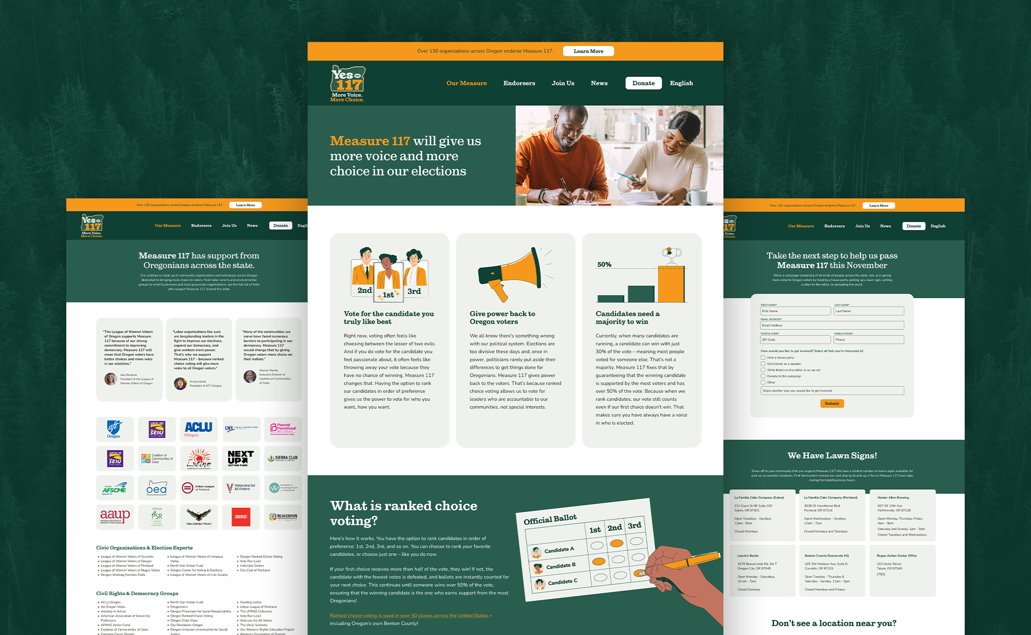 As Head of Creative at Winning Mark, I led the brand development and creative direction for Yes on 117, the ballot measure campaign to introduce Ranked Choice Voting statewide in Oregon. In a year with an unusually sparse slate of measures on the ballot, Measure 117 drew significant attention from voters and the media. In developing the Yes on 117 brand, I worked with stakeholders to understand their unique audiences and build buy-in, leading to a brand that could flex from memes to white papers.